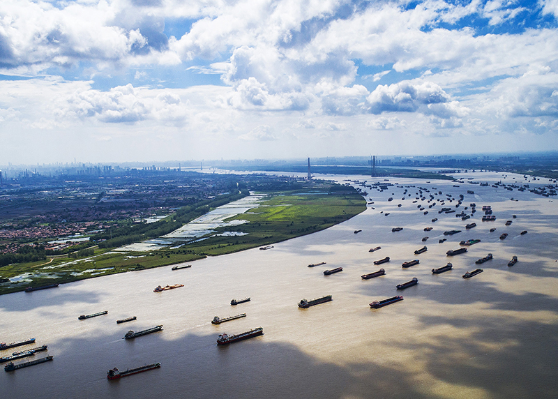 船舶在湖北省武漢市陽邏港區(qū)水域行駛(2018年8月13日攝,無人機(jī)照片)。新華社記者 肖藝九 攝