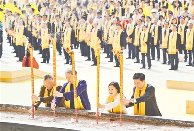 當日上午,黃帝故里園區(qū)旗幡獵獵、莊嚴肅穆。南門廣場上,龍騰虎躍,鼓聲震天。寓意著中華兒女來自五湖四海的540名炎黃子孫,分別組成各90人的文化方陣、岐黃方陣、企業(yè)方陣、同拜方陣、臺胞方陣、僑胞方陣六大拜祖隊伍,整肅衣冠,佩戴黃帝絲巾,進尋根門、經(jīng)系祖壇、上軒轅橋、過故里祠,觀甲骨碑林方柱高舉,感杜嶺方鼎王者風范,聽青銅編鐘古音繚繞,最后緩步來到拜祖廣場,端詳兩側(cè)連廊浮雕,感觸中華文明五千多年的源遠流長。