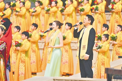 高唱頌歌。來自香港地區(qū)的鐘鎮(zhèn)濤、臺灣地區(qū)的朱孝天和澳門地區(qū)的麥嘉欣以及內(nèi)地的曹芙嘉,與56個民族的少年兒童一起,同歌《黃帝頌》,共聚家國情。