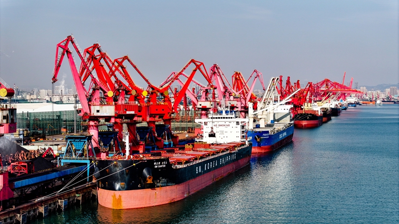 在山東港口日照港煤炭泊位,貨輪停泊卸煤(2024年12月4日攝,無人機(jī)照片)。新華社記者 郭緒雷 攝